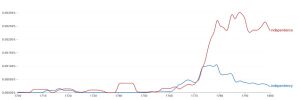 The very first printing of the Declaration on July 6, 1776, in The Pennsylvania Evening Post, simply repeats the title on the original. But in subsequent days, newspapers began to call the document the “Declaration of Independence,” as captured in this example from Pennsylvania Packet on July 8: “THIS DAY, at Twelve o’clock, the DECLARATION OF INDEPENDENCE, will be PROCLAIMED at the STATE-HOUSE.” And after 1776, “independence” became the coin of the realm, as captured in this graph of American English, 1700–1800, from the Google Books Ngram Viewer: